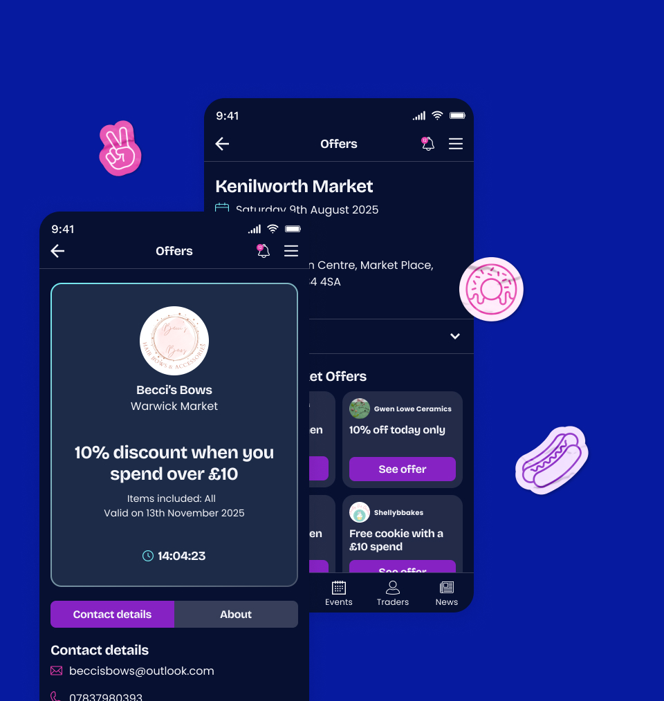 See which traders will be at each event, so you can plan who to visit. Tap through to full trader profiles with photos, categories and contact details.
