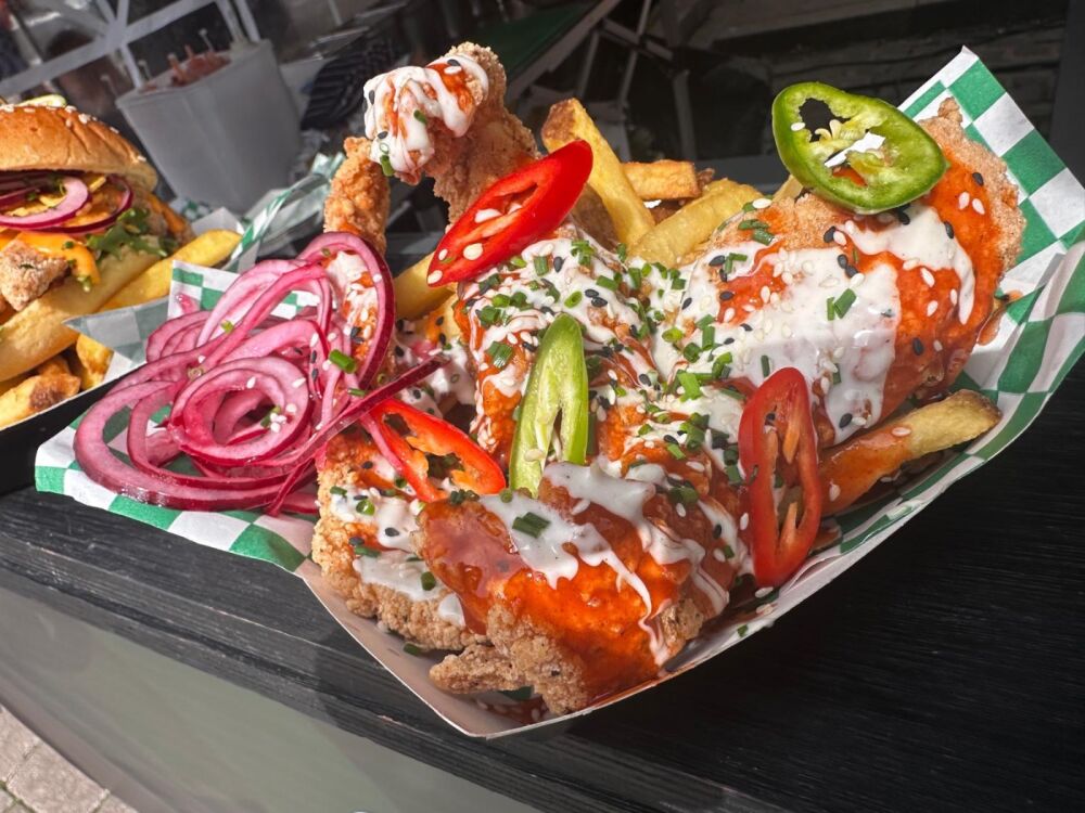 We do the nacho chicken burger, strips and wraps. Loaded fries, loaded nachos and hot dogs