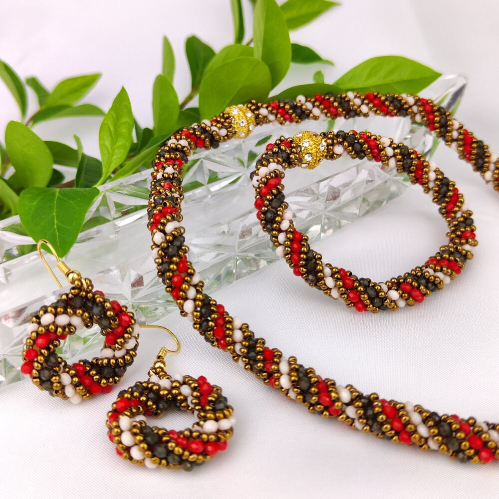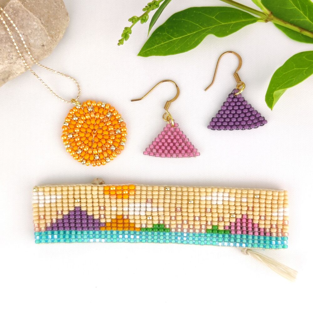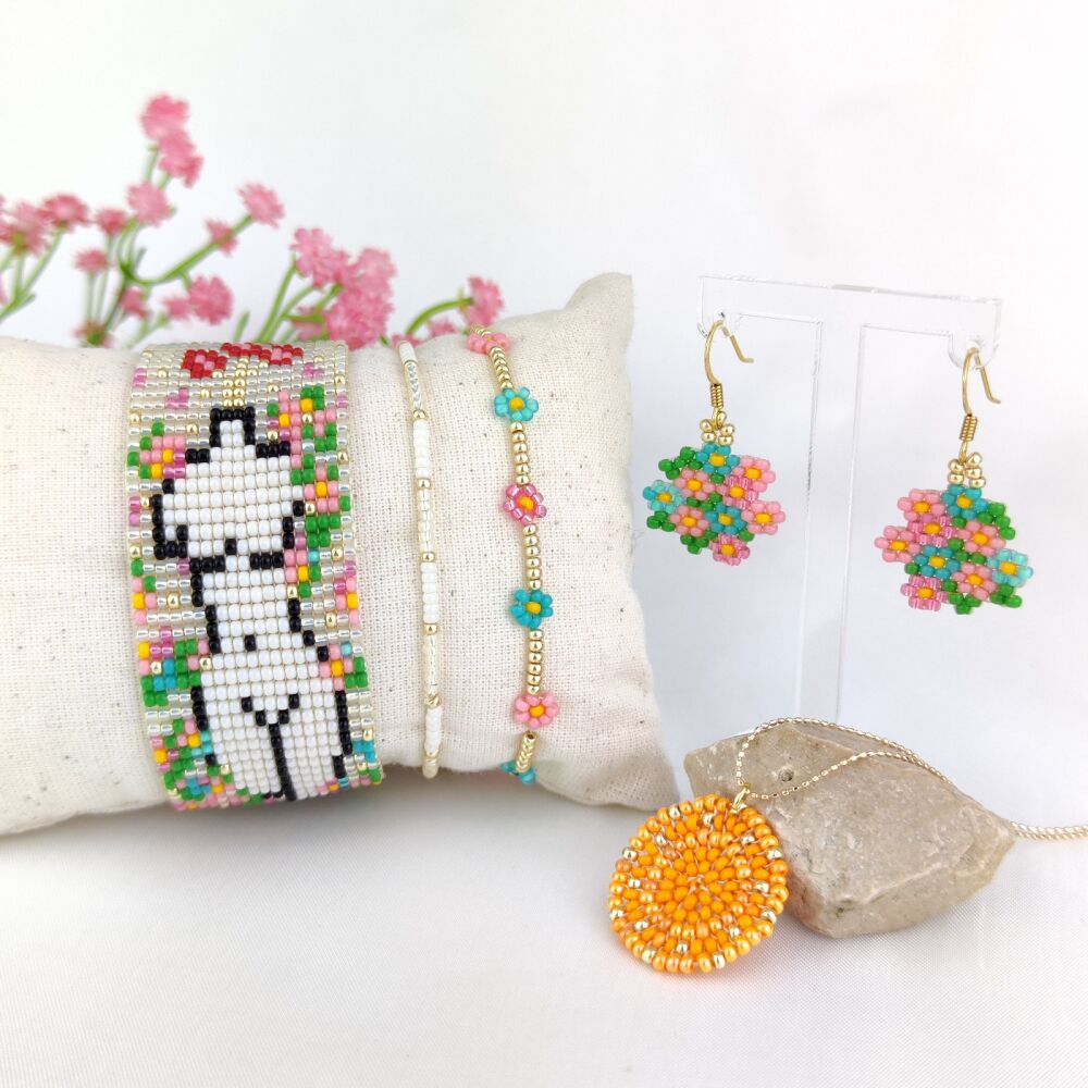I make traditional and designer Mediterranean-style beaded jewellery such as beadloom bracelets, handwoven earrings and handwoven necklace pendants. I use glass beads, ceramic beads and gemstone beads (crystals, natural stones) in my designs.