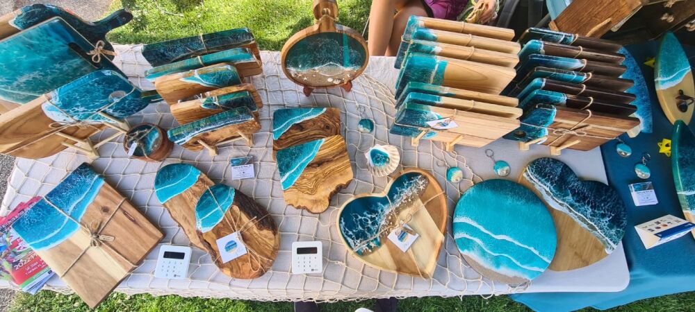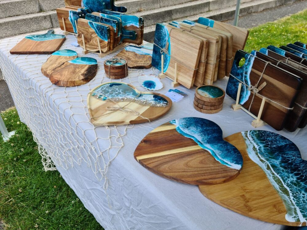Ocean inspired wood decor and home accessories decorated with resin ocean waves.