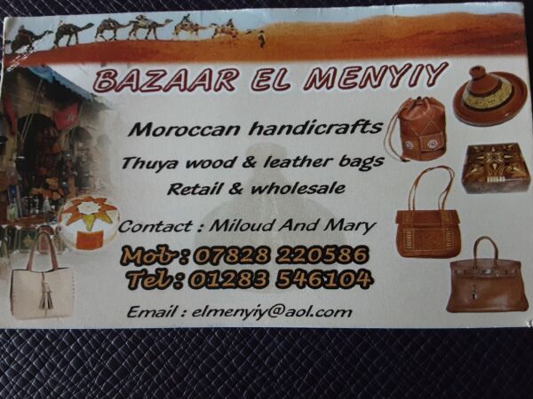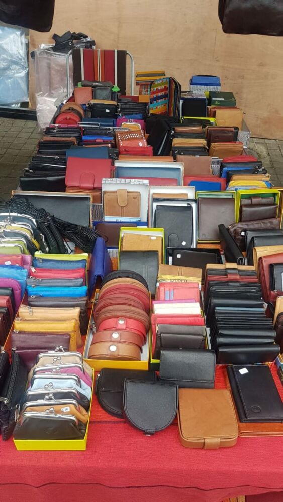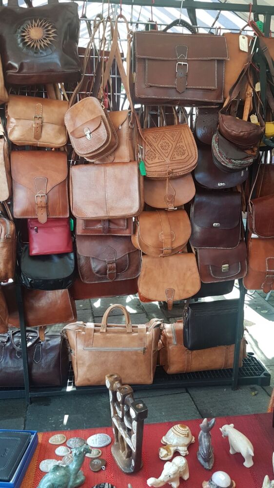 Moroccan leather goods including bags, belts, bracelets, purses and wallets.