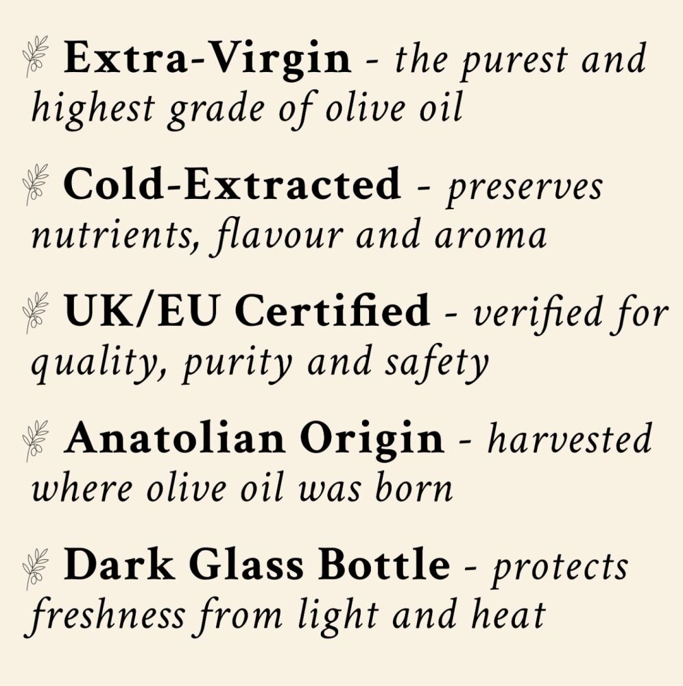 LUVIA offers premium cold-extracted 100% extra virgin olive oil sourced from the Aegean region of Türkiye. Our oils are unblended, single-origin, and bottled in small batches to ensure freshness and quality. We focus on authenticity, purity, and flavour — ideal for dipping, dressing, or gifting.
