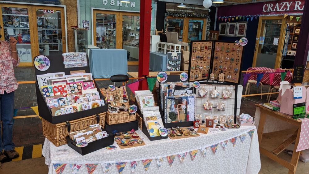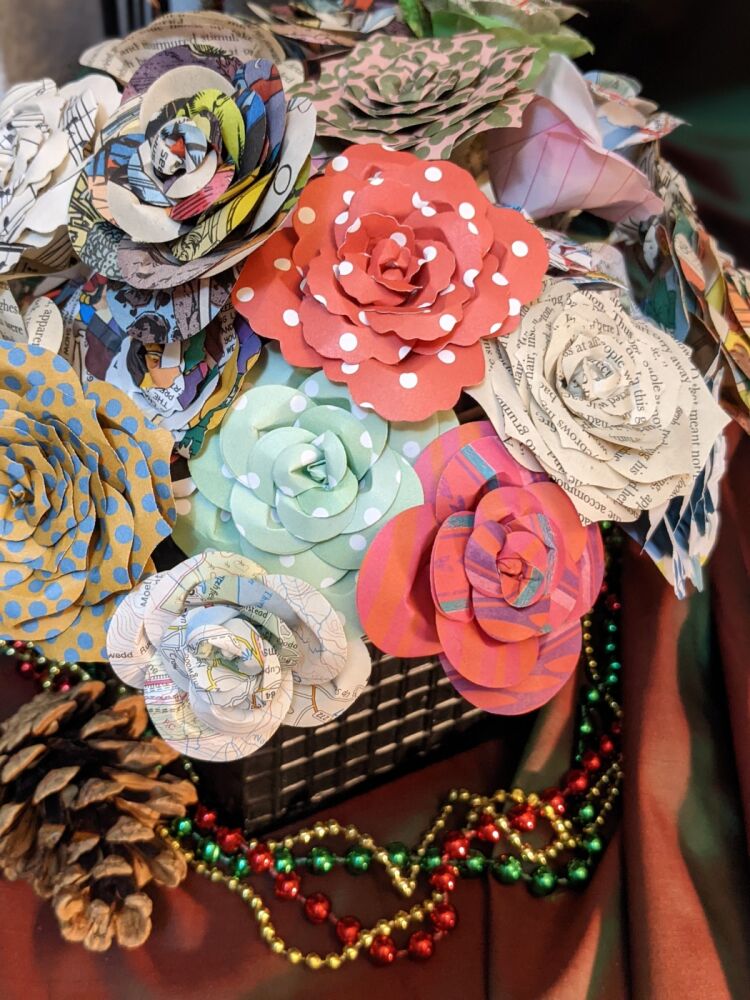 I make upcycled goodies using pre-loved and second hand materials, including paper flowers made from maps, books and comics, jewellery made from old jewellery and paper beads and various home decor items, along with greetings cards made from old cards and packaging!