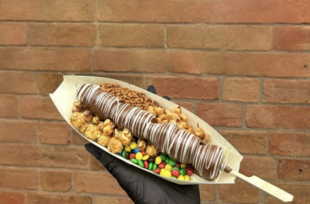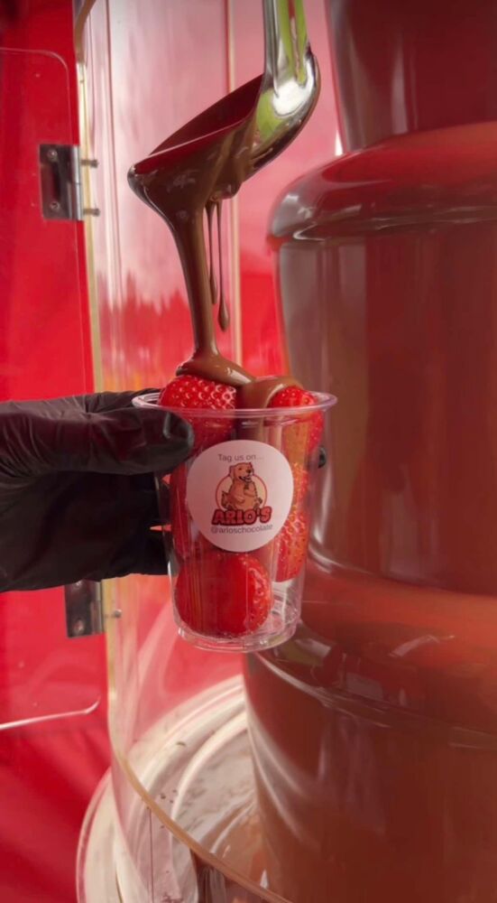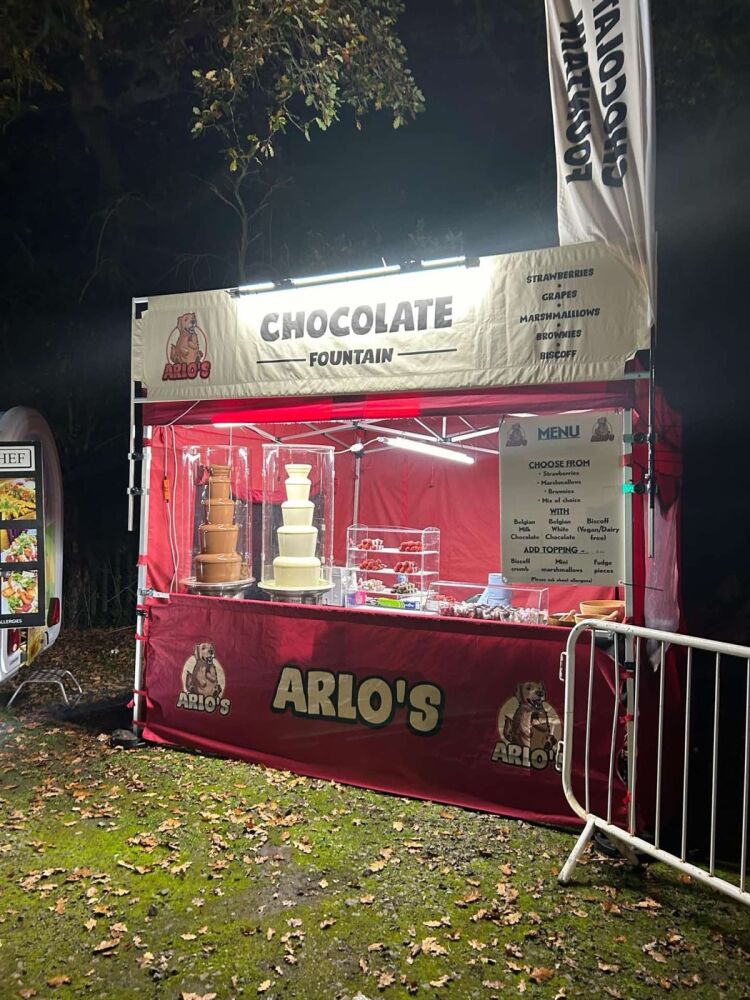 Chocolate fountain stall with milk chocolate, white chocolate and biscoff, served with cups/skewers of strawberries, grapes, marshmallows, brownies and more!