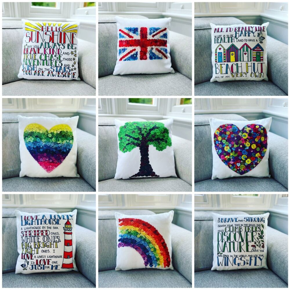 Artwork made from buttons, felt and other mediums such as ink, watercolours etc. Lots and lots of rainbow happy greetings cards! Some awful puns. 😆