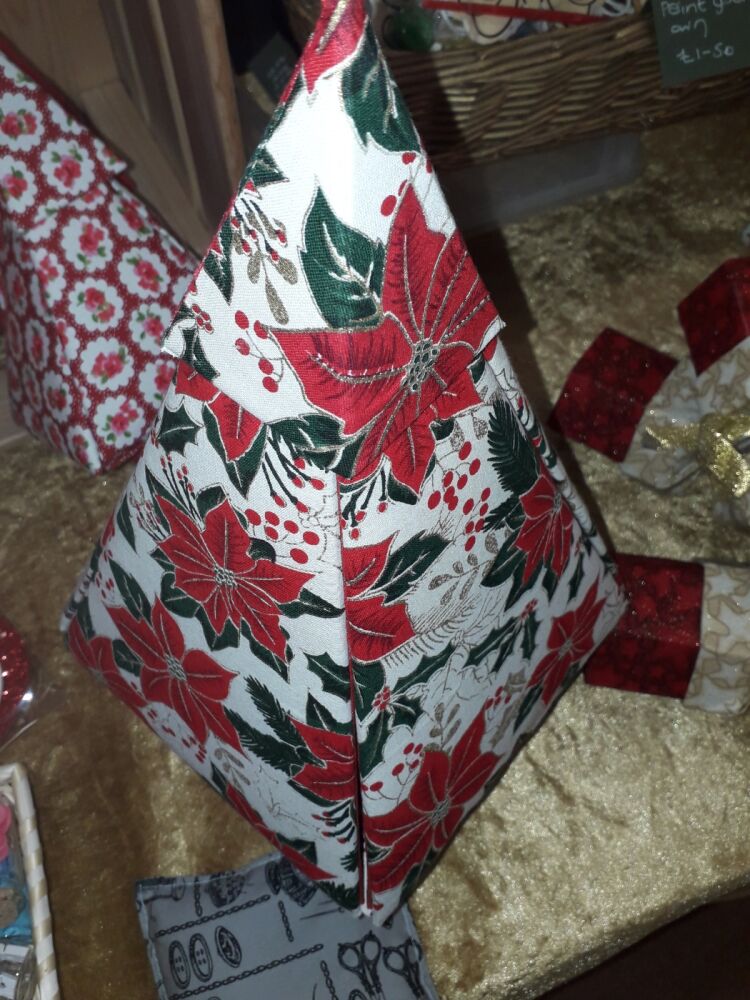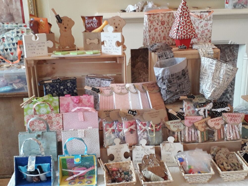 Many handmade gift items including padded memo boards, fabric trees, fabric gift handbag/box, plaques, fabric crackers, manicure sets, and much more