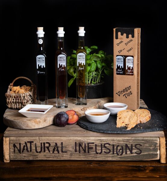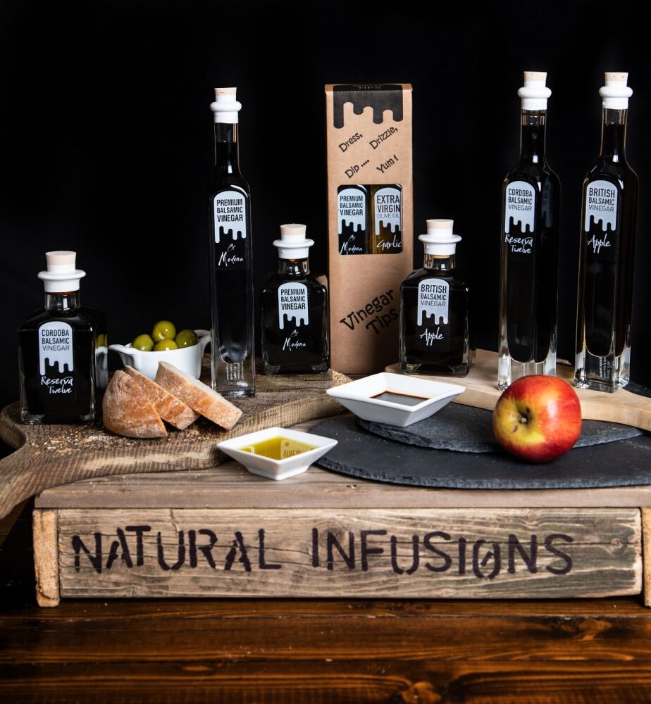 I MAKE A LARGE RANGE OF NATURALLY INFUSED SWEET VINEGARS WITH HERBS , BERRIES FLOWERS AND ROOTS , ALONG SIDE THESE TO COMPLIMENT THEM I HAVE ITALIAN PREMIUM NATURALLY INFUSED EXTRA VIRGIN OLIVE OILS AND BALSAMIC VINEGARS