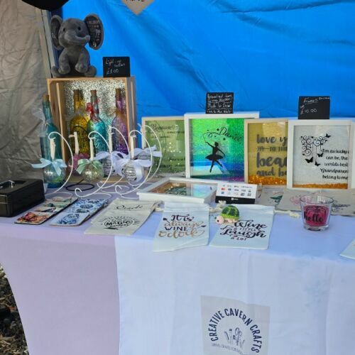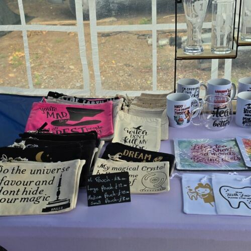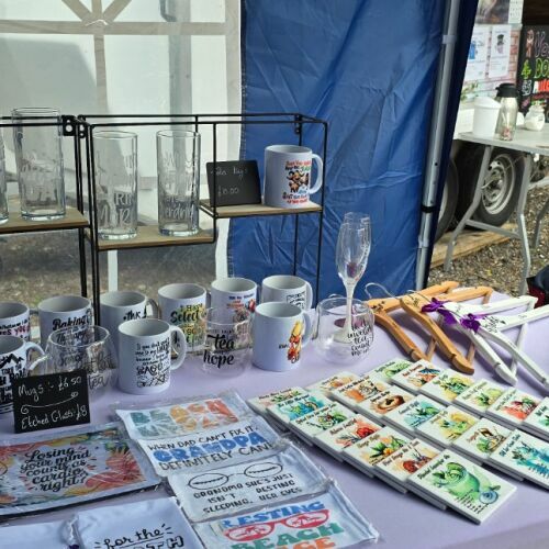 Personalised frames, light up bottles, etched glasses, vinyl glitter glasses, vinyl make-up bags, tote bags, sublimated mugs, sublimated wine bottle covers,