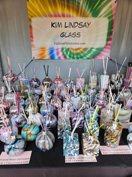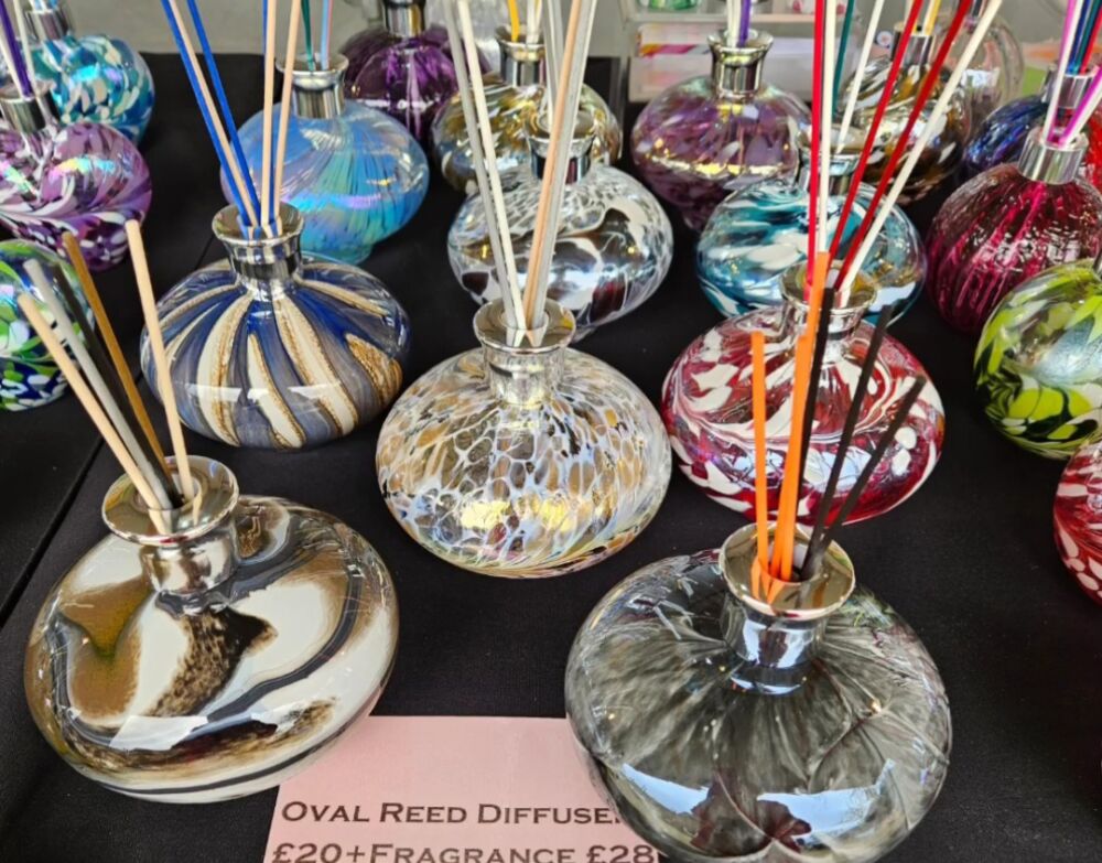Hand blown glass reed diffusers, fragrances, glass friendship hearts & balls.