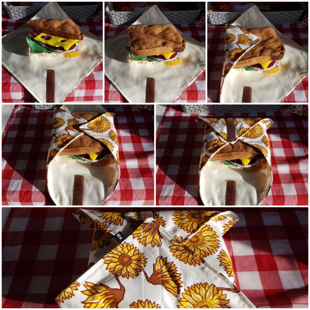 Ranging from Lunch box essentials, not bees wax food wraps, snack bags, utensils pouches, reusable cloths, baby wipes, shopping bags, draft excluders, door stops, kitchen cloths, peg bags, aprons, bowl covers, cable tidies, hair accessories, bookmarks, cleaning cloths, small pouches and purses, and much much more. All designed to be reusable and washable. Completely unique gifts. I also make a selection of upcycled gifts too, with some hand painted fabric items.
