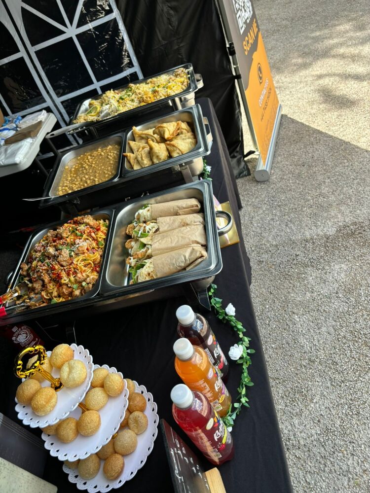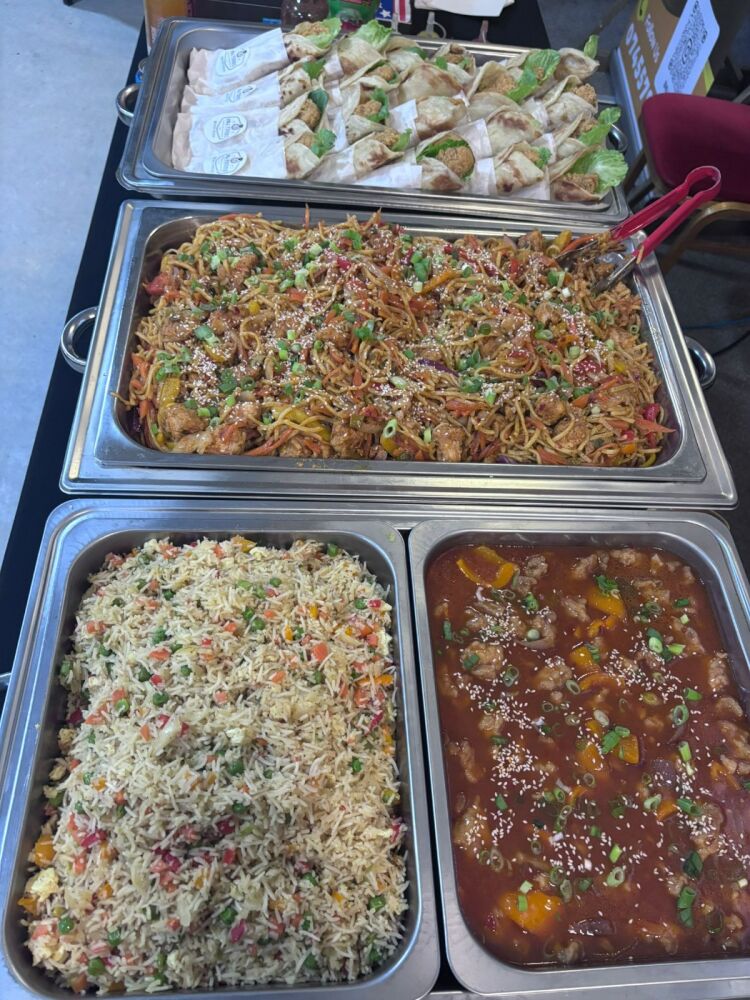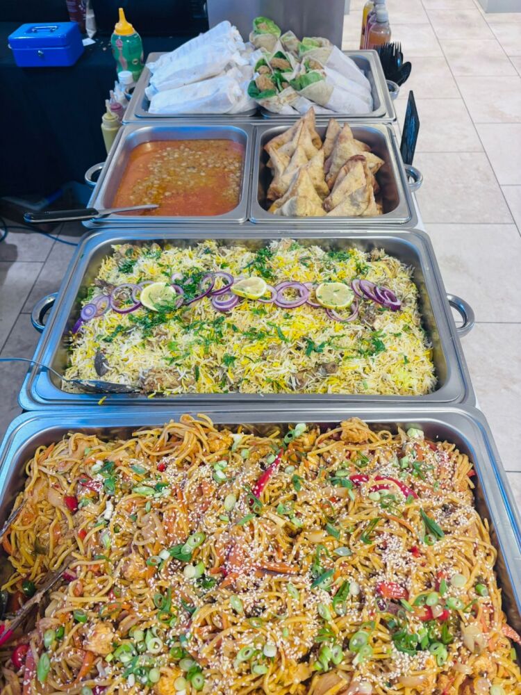 Biryani, Egg noodles, chicken wraps, samosa, fried chicken and hotdogs