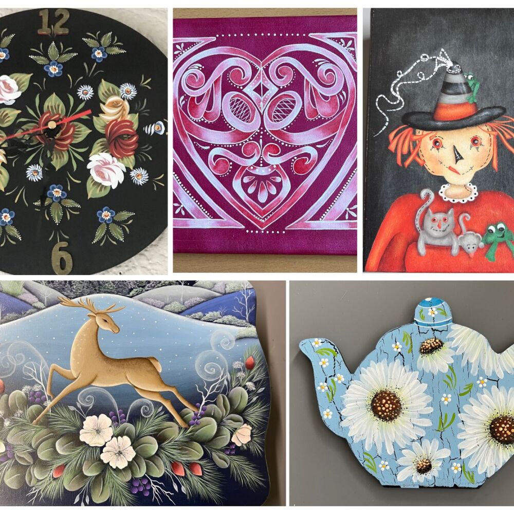 Items and gifts from cards to canvas, gift boxes, metal ware and more painted in Folk Art or Canal Art styles.