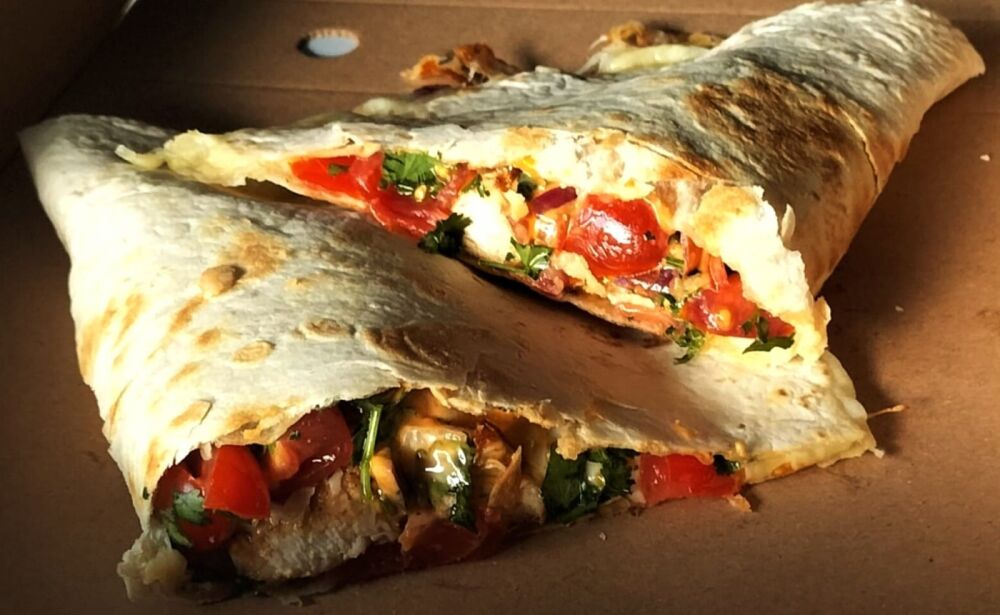 Quesadilla: Mexican chicken, Pico de Gallo, grated cheddar cheese and mozzarella
