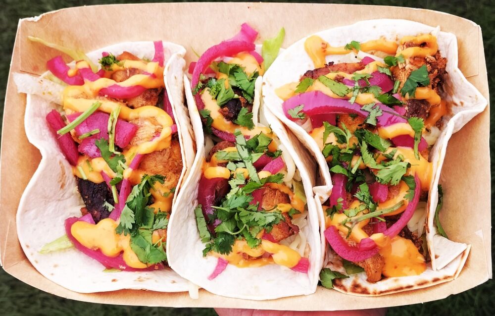 Tacos: Mexican chicken, grated cheddar cheese and mozzarella, lettuce, pink pickled onions, coriander