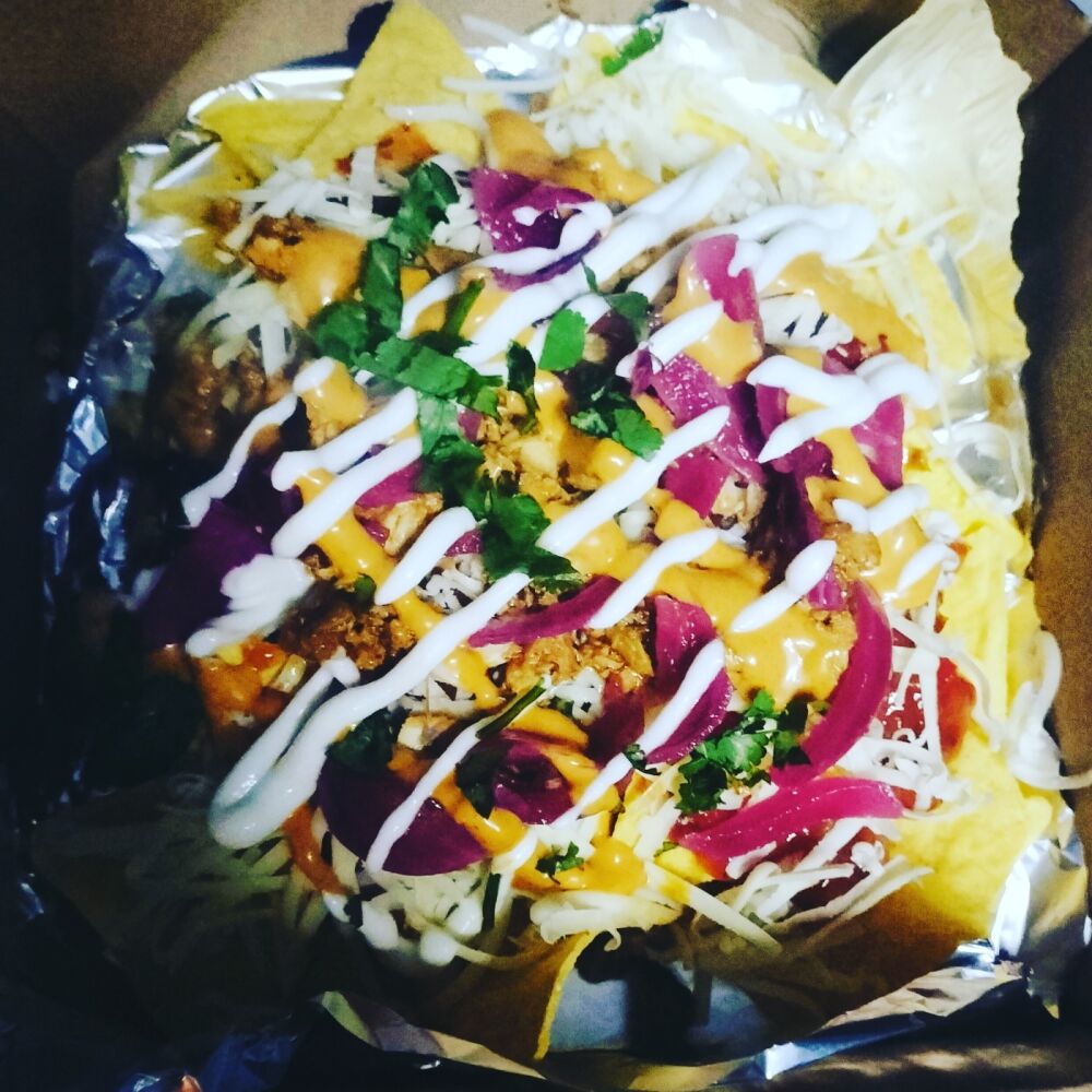 Chicken loaded nachos: Mexican chicken, pink pickled onions, tortilla chips, salsa, cheese, coriander