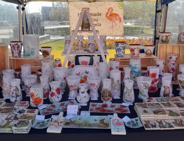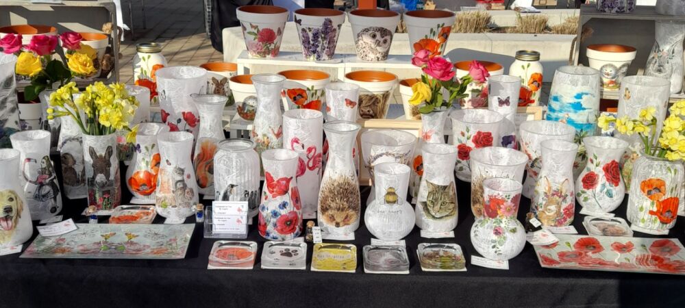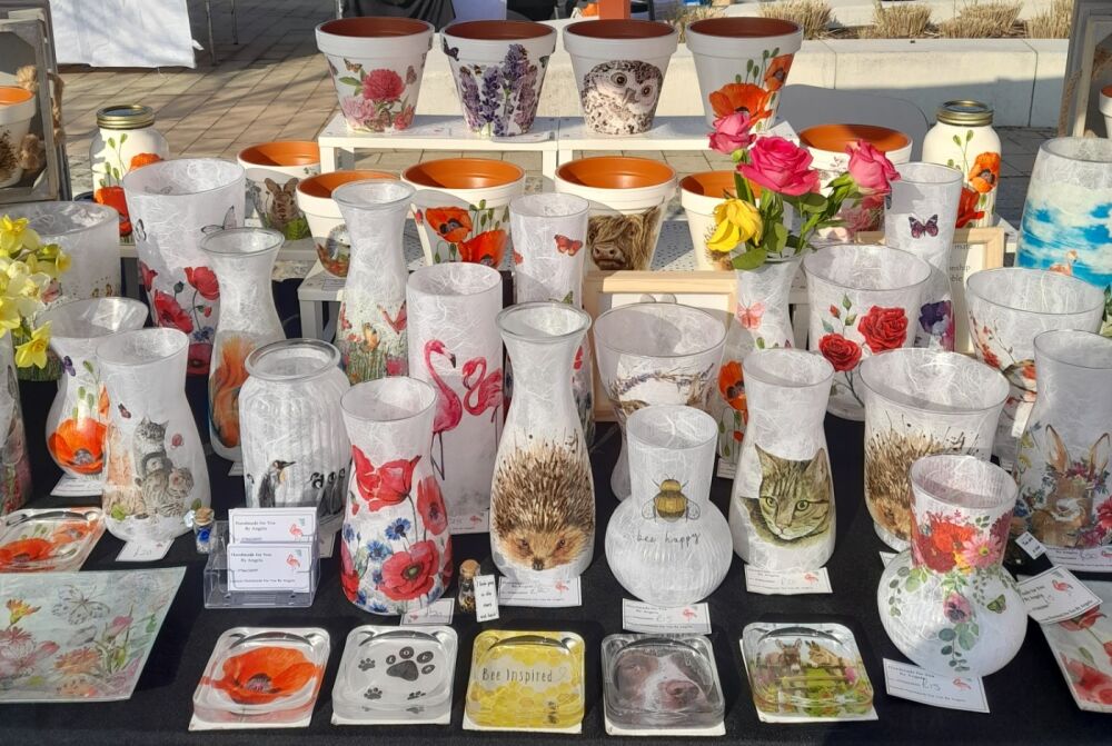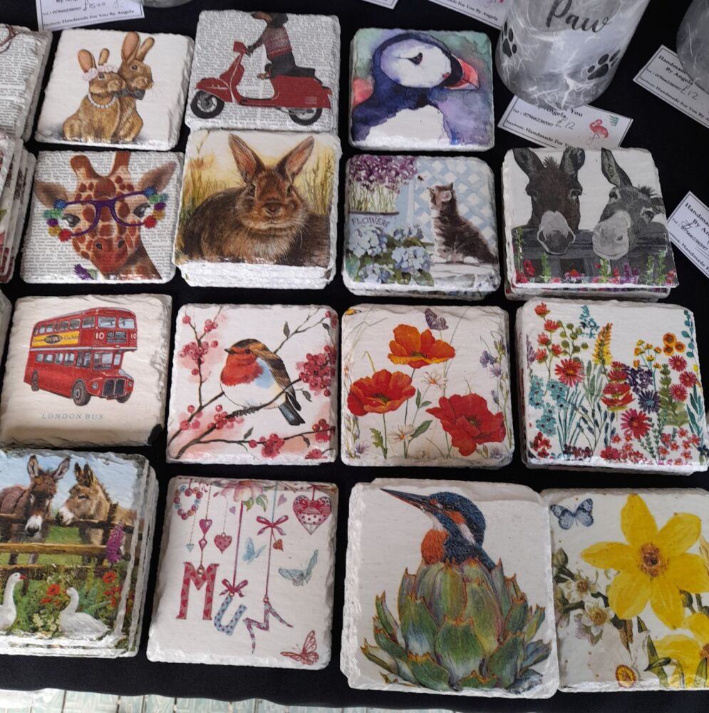I sell all handmade decoupaged items including vases, slate and tile coasters and plant pots. I also sell small pebble gifts in organza bags and dexoupaged glass dishes and trays.