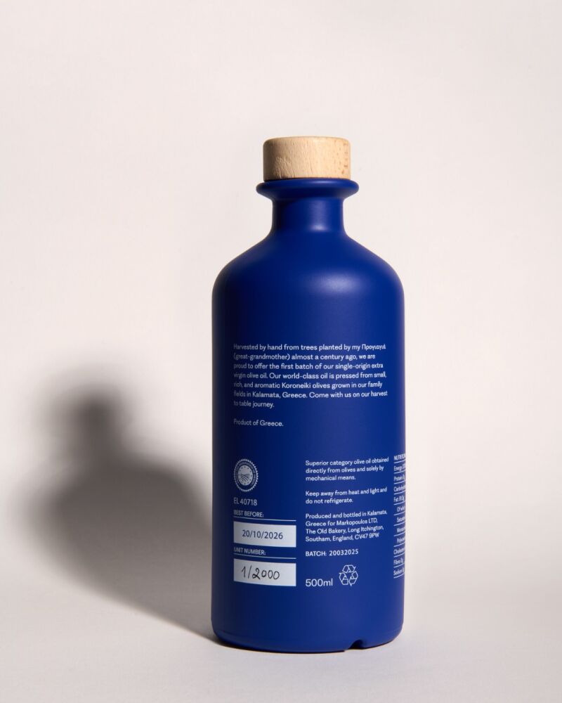 Extra-virgin single origin olive oil from kalamata greece. Harvested by hand from trees planted by my great-grandmother almost a century ago, our family is proud to offer the first batch of our organic, single-origin, extra virgin olive oil. Our world-class oil is pressed from small, rich, and aromatic Koroneiki olives grown in our family fields in Kalamata, Greece.