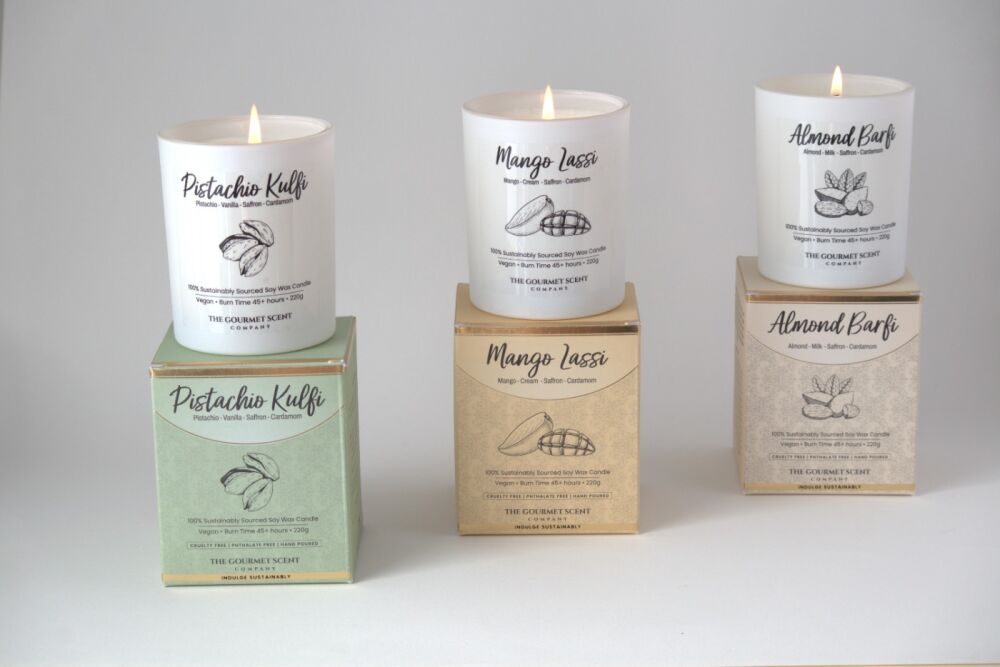 Our gourmet candle collection brings indulgent, food-inspired scents together with sustainable, ethical ingredients. Made with 100% non-GMO, ProTerra Certified soy wax from the EU, each candle is vegan, cruelty-free, and hand-poured with care. We’re a South Asian woman-owned brand giving back 5% of profits to support children, women, and solar access.
